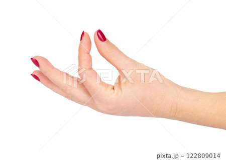 Female Hand with Red Manicure in Slightly Curved Offering Gesture on White Background