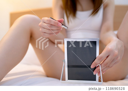 VIOデリケートゾーン股間のセルフケアをする若い女性 鏡を見ながらピンセットで毛抜き 昼白色