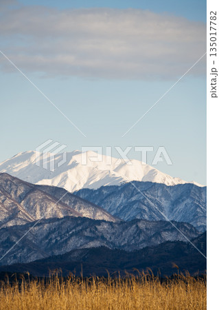 ビュー福島潟の屋上から見る福島潟と二王子、大日岳冬景色