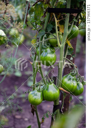 Bunch of fresh tomatoes growing on plant branch on sunny day in garden