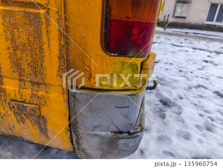 Rear corner of yellow vehicle heavily stained with greenish grime and snow residue, showcasing age, neglect, and weather exposure during winter.