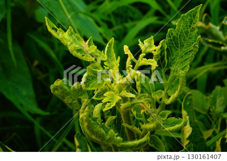 Disease or damage by insects by pests of the tomato plant bush, in which the apical leaves begin to curl abnormally and stop growing in length, the build-up of green mass for photosynthesis stops