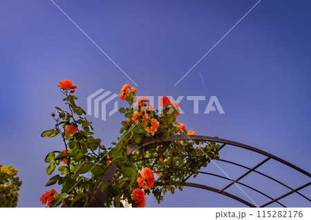 青空とアーチ上の薔薇、5月10日、大阪、日本