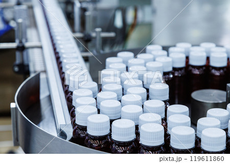 Glass bottle with cap on production line of conveyor belt at filling machine in medical factory. pharmaceutical and supplement manufacturing.