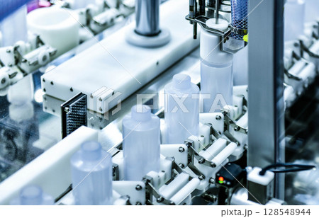 The drug bottle filling process by automatic system in the light blue scene.