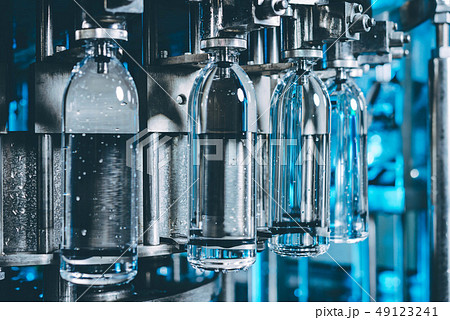 transparent plastic bottle on factory line machine in the beverage manufacturing, selective focus.