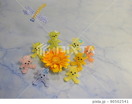 ガーベラの花と手作りビーズテディベアの仲間たちとトンボ
