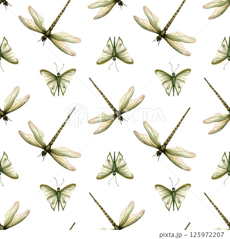 Seamless pattern with dragonfly and butterfly. Summer insects. Entomology. Watercolor illustration on white background. For wrapping paper, packaging, textile, stationery, scrapbook, print product