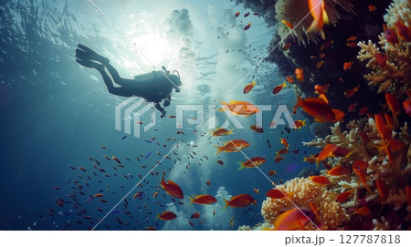 A low-angle shot captures a diver exploring a vibrant coral reef teeming with colorful fish.
