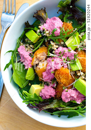 サーモンフライのサラダ、ソバの実とビートルートのタルタルソース