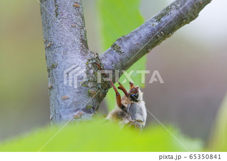 Cockchafer Melolontha May Beetle Bug Insect Macro Portrait. Maybug nibbles on a peony flower
