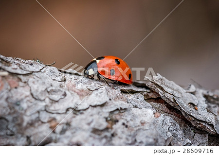 Black and red Firebug or Pyrrhocoris apterus, on a old tree trun