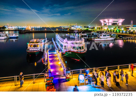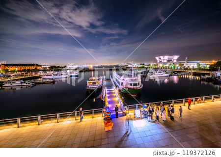 日本の横浜都市景観 横浜・ピア象の鼻観光船乗り場のゆめはまやみなとみらいの夜景を望む=10月11日