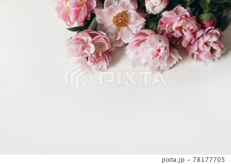 Spring decorative floral corner, banner made of pink peonies flowers isolated on white table background. Empty copy space. Flat lay, top view. Picture for blog. Summer wedding or birthday concept.