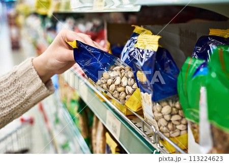 Hand with packing of salted pistachios in store
