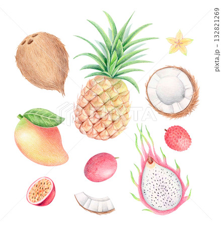 Tropical fruits, colored pencil and watercolor illustration