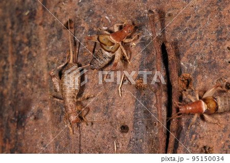 生き物 昆虫 カネタタキ、十月の肌寒い公園の遊歩道。二頭のオスがメスにアタック中