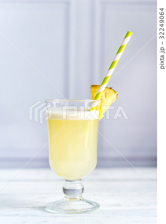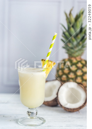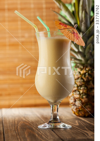 Closeup glass of pina colada cocktail at bright bar counter background.