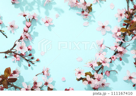 Spring twigs with flowers on a blue background.