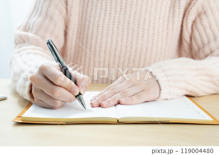 ボールペンでノートにメモをする女性の手元