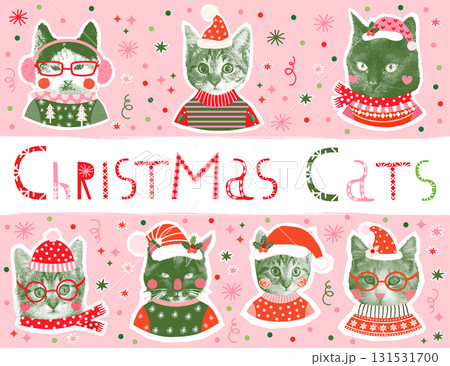 Cute and funny vector Christmas cat faces, Half tone collage designs for holiday banners and greeting cards