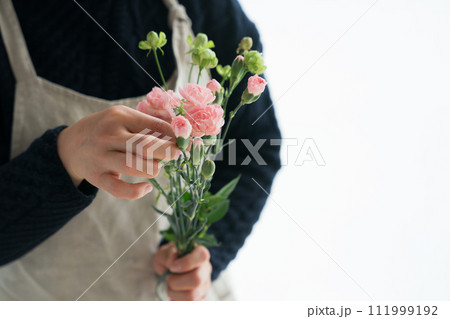 カーネーションを持つエプロン姿の女性