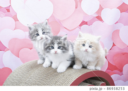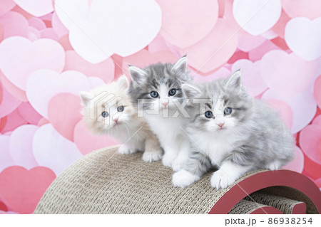 ハートのバックと見上げる3匹の子猫(ノルウェージャンフォレストキャット)