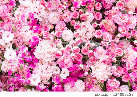 一面のピンク色のバラやアジサイ、ランの花のフラワーアレンジメント