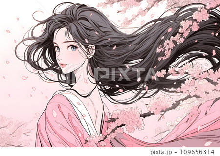 anime style of Goddess with cherry blossom motif on fantastic background.