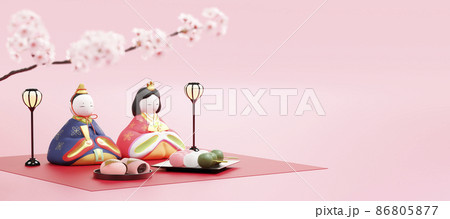 桃色の背景に置かれたひな人形と和菓子 / コピースペースのあるひな祭りフェア・セール用背景素材