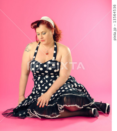 Pin-up classic sexy woman in red corset and pink dotted stocking