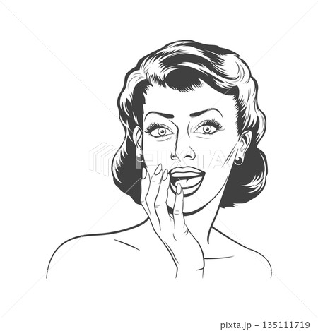 Vintage Comic Style Surprised Woman Face Line Art, Vector Illustration. Retro Pop Art Female Portrait with Hand on Mouth. Black and White Expression Illustration for Sticker, Poster,nd T-Shirt Design