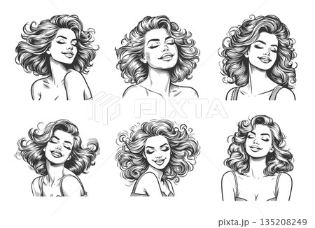 Smiling retro pin-up women portraits set raster