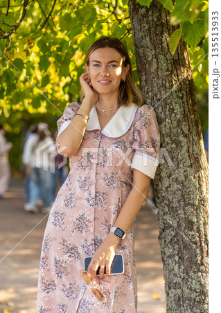 A woman stands gracefully by a tree at Peterhof, dressed in a floral dress, capturing the essence of a bright and lively outdoor day with visitors nearby.