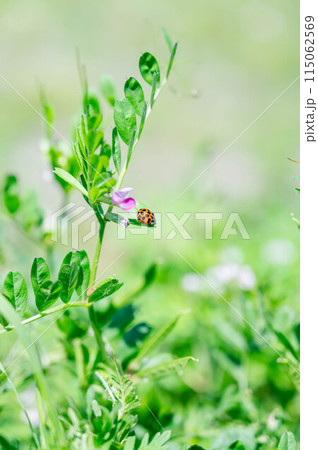 春の日差しを浴びたテントウムシ(カラスノエンドウの葉上のナナホシテントウ)