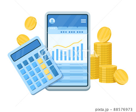 スマートフォンでお金の管理や計算をするイラスト. ファイナンシャルプランのコンセプトデザイン.