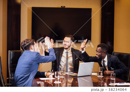 In a corporate setting, an enthusiastic group of business people high-fives during an important meeting, embodying the essence of teamwork and the fulfillment of strategic goals.