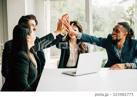 A heartwarming display of cooperation and camaraderie in the office, colleagues celebrate their triumph by exchanging high-fives during a meeting, highlighting the power of unity and support.