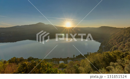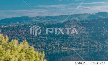 Panoramic view of Albano Lake coast at sunrise timelapse, Rome Province, Latium, central Italy