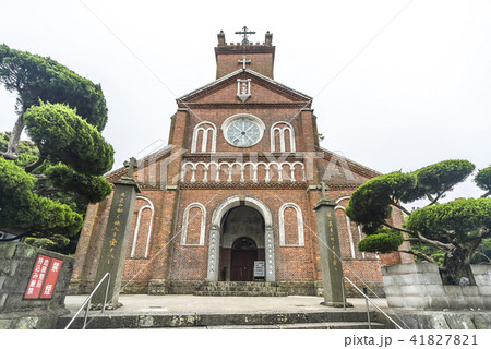 [九州・長崎] 赤レンガのカトリック浦上教会の前に立つ被爆遺構。