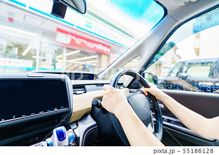 [交通イメージ] 営業車を運転中に一休みを目的にコンビニに向かう女性のシーン(顔なし)