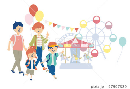 遊園地に遊びに来た家族のイラスト
