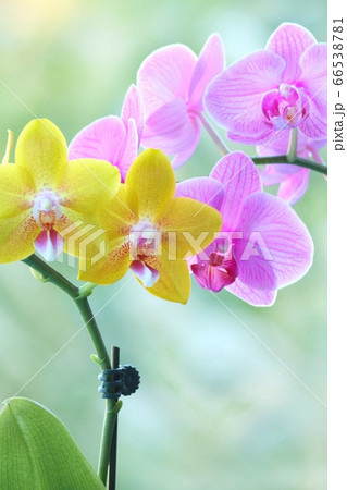 ミディタイプの胡蝶蘭 ピンクと黄色の花 自然背景