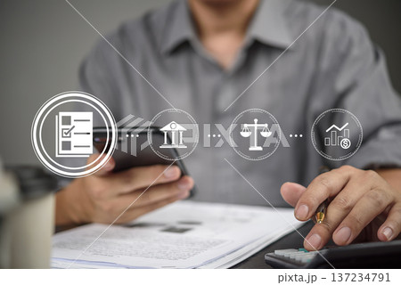 Businessman hand using smartphone calculator for tax payment, mobile banking. Virtual interface icon checklist, bank, legal, investment. Financial technology (Fintech) concept, document analysis.
