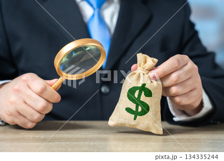 An official examines a dollar money bag with a magnifying glass. Budget assessment. Origin of capital. Financial transparency, audit procedures and investigation of funding sources.