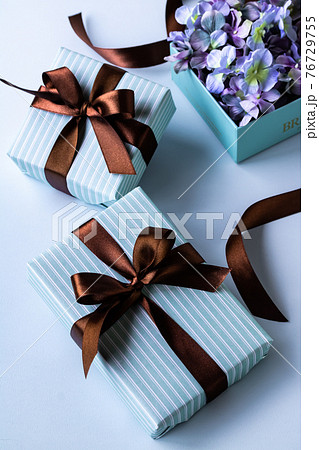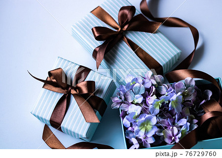 ピュアで爽やかで上品な色サックスブルーのリボンの贈り物