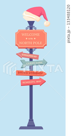 Cartoon Color Christmas Road Sign with Red Santa Hat Xmas or New Year Decoration Concept Flat Design Style. Vector illustration