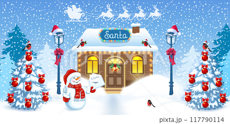Christmas card with Santa's workshop home, Snowman with wish list and streetlamp against winter forest background and reindeer team. New Year postcard.
