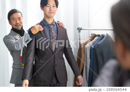 鏡の前で洋服のフィッティングをするベテランのスタイリスト