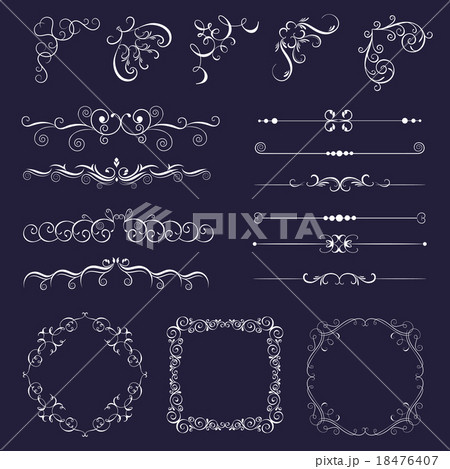 Decorative design set featuring flourish borders, corner elements, and frames, ideal for invitations, menus, and page embellishment